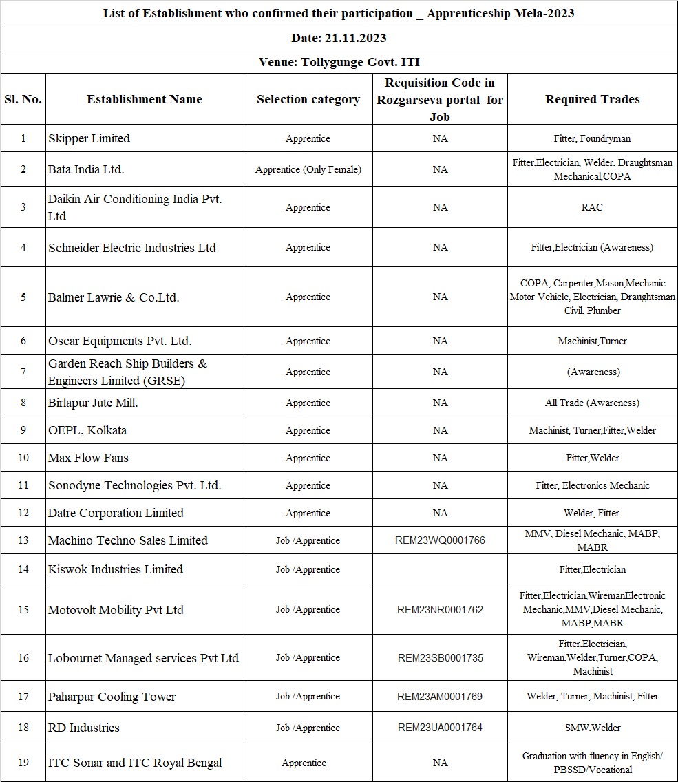 Apprenticeship Mela cum Job Fair 2023 : বেকার সমস্যা দিন দিন বেড়ে চলছে। বিশেষ করে শিক্ষিত তরুণদের বেকারত্বের হার উদ্বেগজনক পর্যায়ে পৌঁছেছে। এই সমস্যা সমাধানের জন্য বিভিন্ন সরকারি ও বেসরকারি সংস্থা নানা রকম কর্মসংস্থানের উদ্যোগ গ্রহণ করছে। এরই অংশ হিসেবে সরকারি আইটিআই দুর্গাপুর আগামী ২১শে নভেম্বর, ২০২৩ (মঙ্গলবার) একটি বৃহৎ অ্যাপ্রেন্টিস মেলা কাম জব ফেয়ার আয়োজন করছে। এই মেলায় ৩৯টি কোম্পানি অংশগ্রহণ করবে এবং প্রায় ১৫০০টি শিক্ষানুসন্ধান ও কর্মসংস্থানের সুযোগ দেবে।