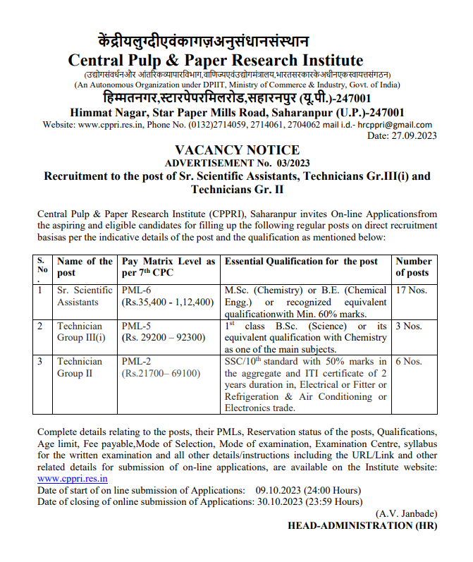 | প্রতিষ্ঠানের নাম | সেন্ট্রাল পাল্প অ্যান্ড পেপার রিসার্চ ইনস্টিটিউট (সিপিপিআরআই) |