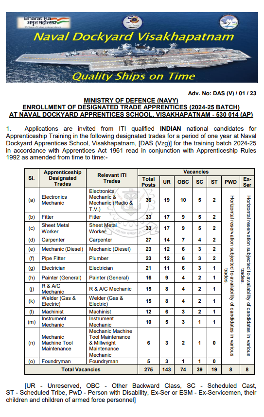Indian Navy Apprentice Recruitment 2023 : ভারতীয় নৌবাহিনীর অধীনে বিশাখাপত্তনমের নেভাল ডকইয়ার্ড, তার নেভাল ডকইয়ার্ড শিক্ষানবিশ স্কুলের মাধ্যমে ট্রেড অ্যাপ্রেন্টিসশিপের (2024-25 ব্যাচ) সর্বশেষ সুযোগ প্রকাশ করেছে। ভারতীয় নৌবাহিনী শিক্ষানবিশ বিজ্ঞপ্তি 2023 এখন উপলব্ধ, আইটিআই যোগ্যতা সহ যোগ্য ভারতীয় নাগরিকদের অনলাইন বা অফলাইনে আবেদন করার আহ্বান জানানো হচ্ছে।