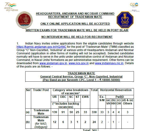 Indian Navy Recruitment : ভারতীয় নৌসেনার Andaman Nicobar Command এর তরফে সম্প্রতি একটি বিজ্ঞপ্তি প্রকাশিত হয়েছে, এতে মোট ৩৬২ টি শূন্যপদে গ্রুপ C বিভাগে নিয়োগ করা হবে।