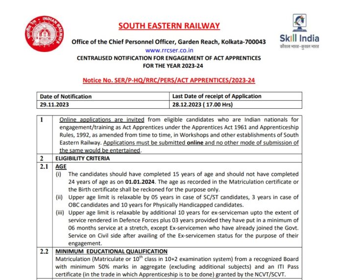 ধাপ-1 : RRC SER শিক্ষানবিশ বিজ্ঞপ্তি 2023-এ বর্ণিত মানদণ্ড পর্যালোচনা করে যোগ্যতা নিশ্চিত করুন।