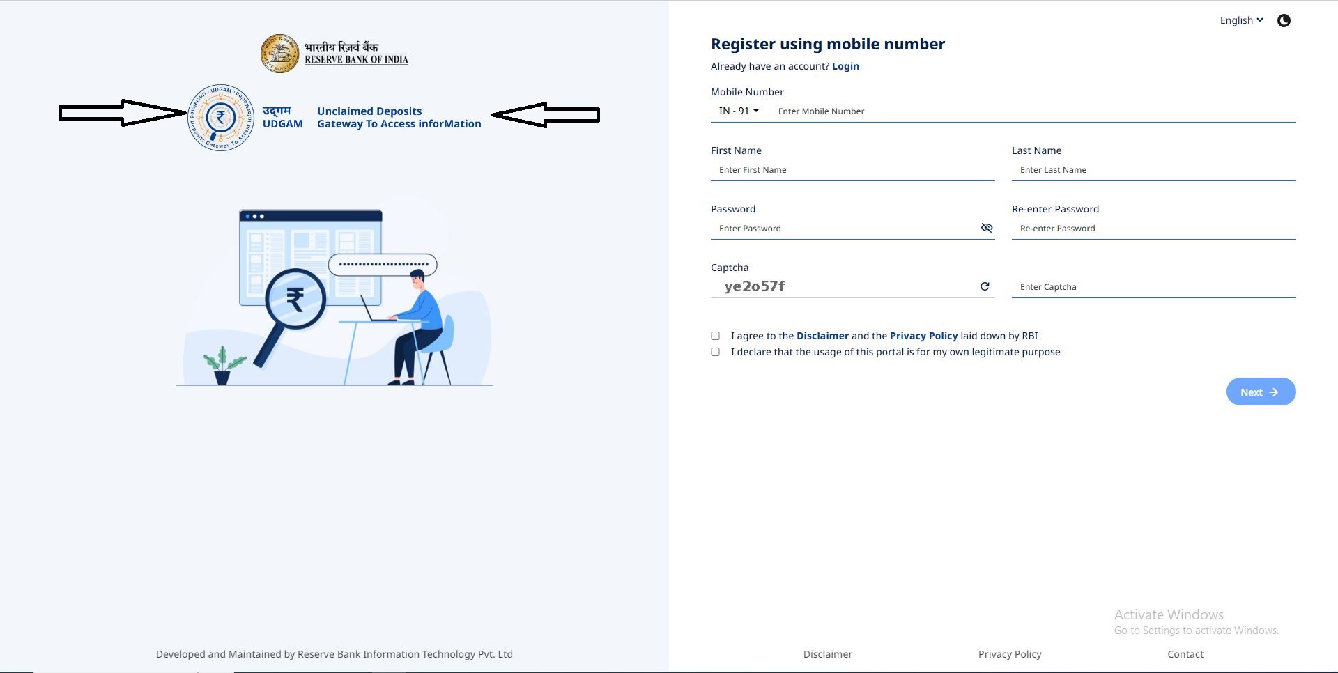 Log in to your Account এ do not have your account এবং Register এই দুটি অপশন রয়েছে। তার মধ্যে Register অপশনে ক্লিক করতে হবে। Register Using Mobile No এর নিচে নিজের মোবাইল নম্বর, নাম, পাসওয়ার্ড এবং ক্যাপচা কোড দিতে হবে। I agree to the disclaimer and privacy policy laid down by RBI এবং I declare that the usage of this portal is for my own legitimate purpose এই চেক বক্সে ক্লিক করে Next অপশনে ক্লিক করতে হবে। এর পরেই অ্যাকাউন্ট সম্পর্কিত বিস্তারিত তথ্য পেয়ে যাবেন।