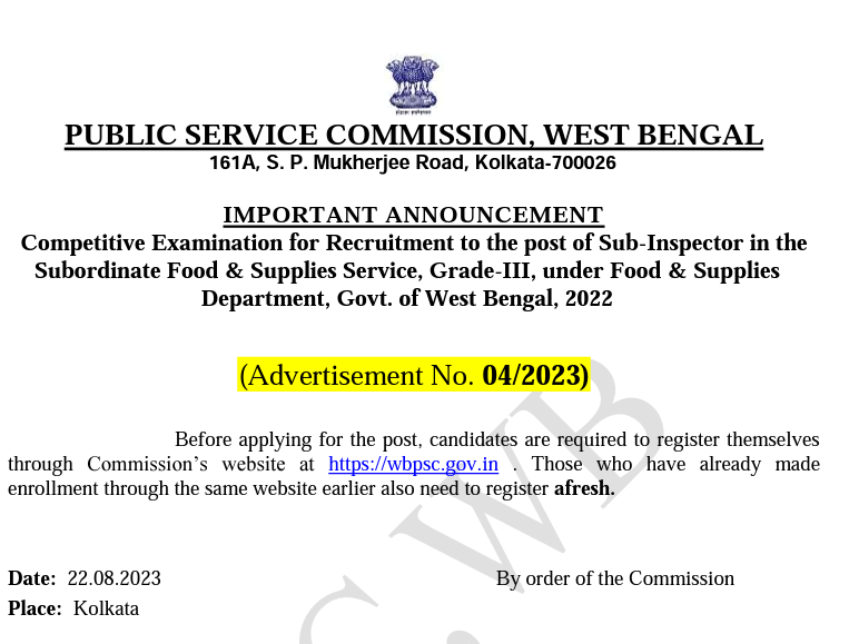 ২২ আগস্ট ২০২৩ (মঙ্গলবার) পশ্চিমবঙ্গ পাবলিক সার্ভিস কমিশন (WBPSC) এর অফিসিয়াল ওয়েবসাইটে প্রকাশিত হলো পশ্চিমবঙ্গে ফুড সাব ইন্সপেক্টর (Food SI) পদে নিয়োগের জন্য সম্পূর্ন বিজ্ঞপ্তি।ফুড সাব ইন্সপেক্টর পদের জন্য কয়টি শূন্যপদ রয়েছে, শিক্ষাগত যোগ্যতা কি লাগবে, মাসিক বেতন, বয়সসীমা, নিয়োগ প্রক্রিয়া, আবেদন পদ্ধতি সহ বিস্তারিত তথ্য।